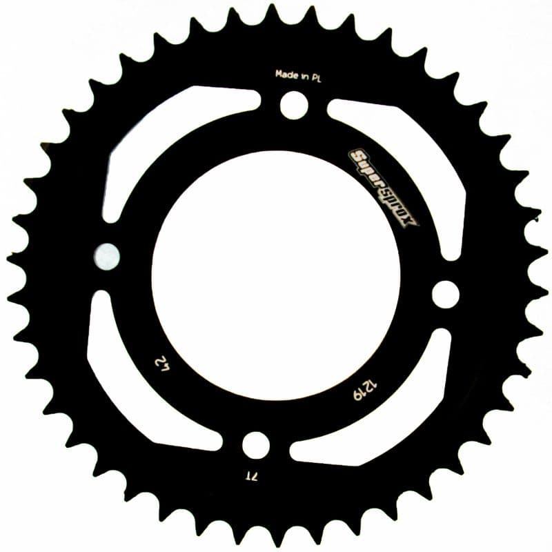 Piñón de 16 dientes, corona en acero de 42 dientes y cadena reforzada sin retenes de paso 428 de 118 pasos y cierre de clip